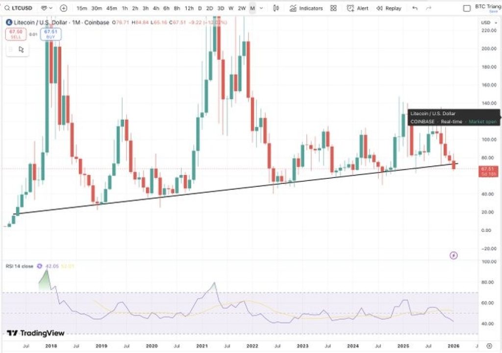 That history alone makes this level important. It is not just another horizontal support, but a structural line that has guided the Litecoin trend for nearly a decade. Right now, the LTC price is trading just above that line, which puts it at a critical decision point.