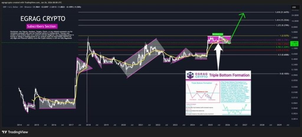 In simple terms, if the XRP price truly breaks out of its long-term range and enters a new expansion phase, targets above the previous all-time high come into play. The $27 zone represents the upper boundary of that projected move.
