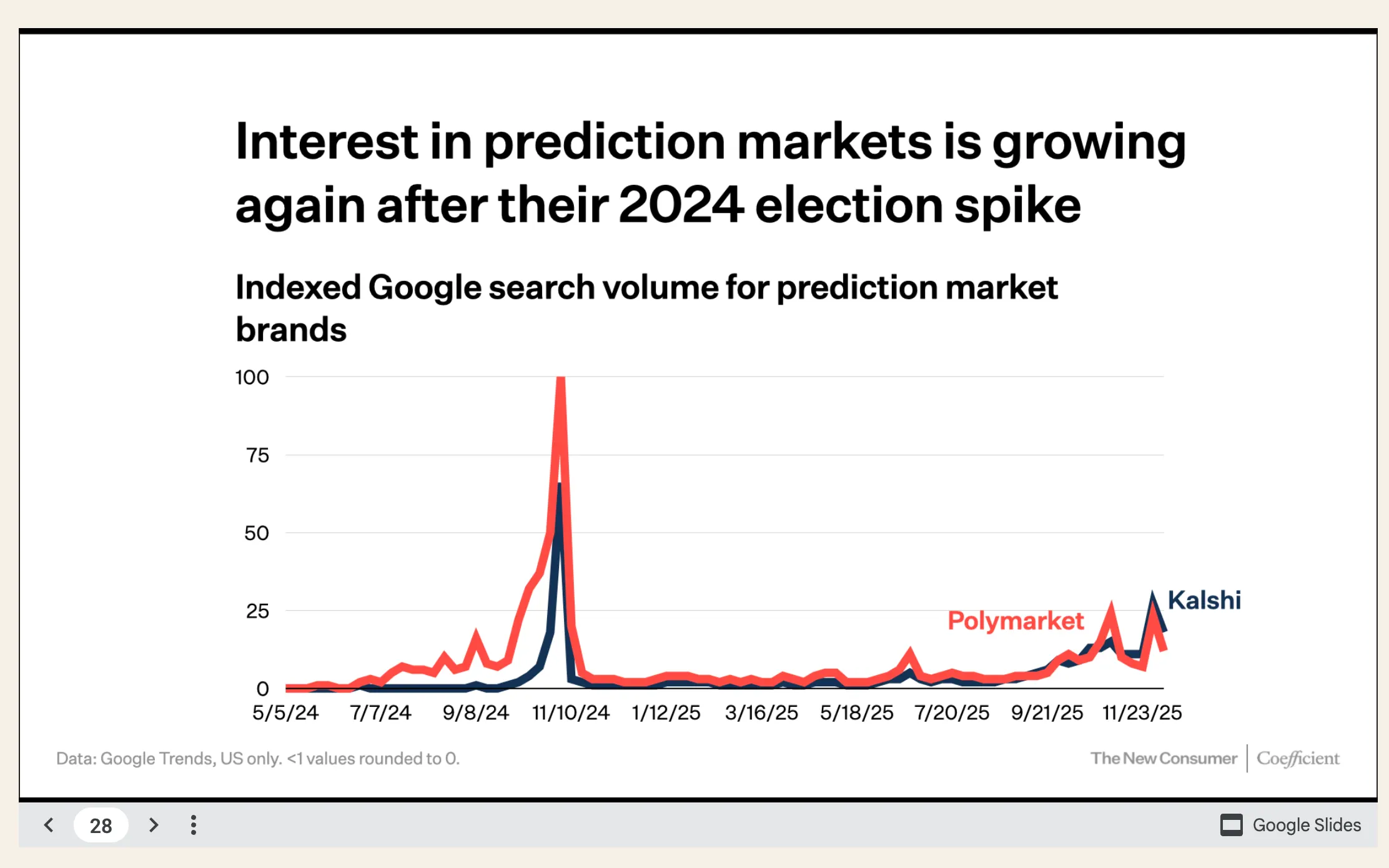 Google search data tells the same story. Interest in prediction markets spiked during the 2024 election. But now that the numbers are back to normal, prediction markets are maintaining search interest 20-30x higher than their pre-election baselines.