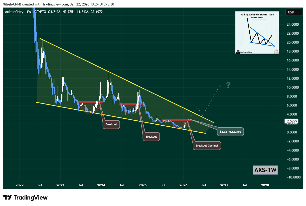 From a technical perspective, the weekly AXS/USD chart paints an interesting picture. Since its peak during the 2021–2022 bull market, AXS has been locked inside a large falling wedge pattern—a structure that often precedes bullish reversals when price begins compressing near the lower boundary.