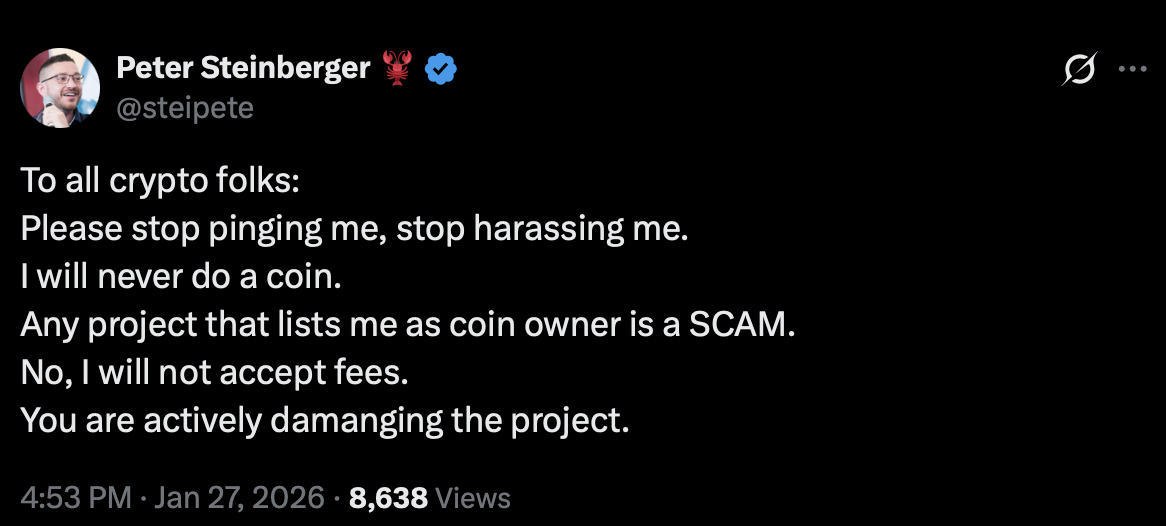 Peter Steinberger clearly explains the token issuance issue. He directly states “will never issue tokens,” which effectively declares that any tokens appearing in the market with his name should be considered fake. Furthermore, he points out that “any project listing him as the issuer of tokens is a scam,” which is not only a refusal to cooperate but also a reminder to the crypto community not to lower their guard just because they see a familiar developer’s name.
