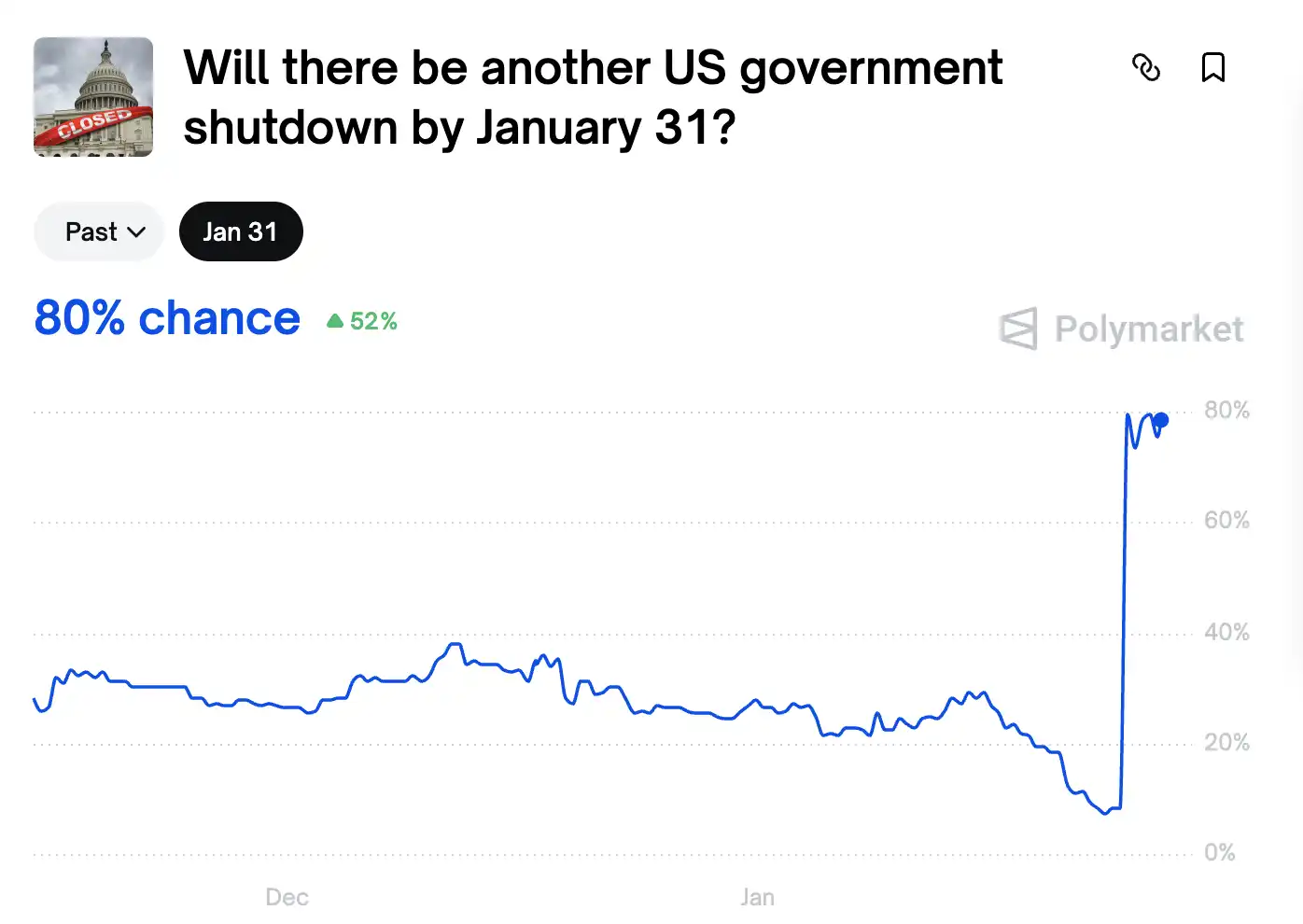 The probability of a “U.S. government shutdown before January 31” on Polymarket has surged to 80%.
