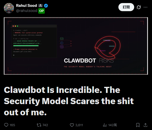Rahul Sood, founder of Microsoft Ventures and CEO of Irreverent Labs, also issued a warning, stating that while Clawdbot is powerful—able to control browsers, read/write files, and manage communication apps like Iron Man’s Jarvis—this “full permission” design is precisely where the risk lies.