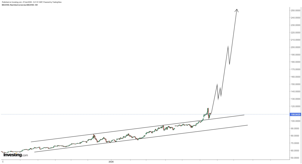 That said, a move from roughly $108 to $250 in just a few months would require an extreme acceleration that is rarely seen outside of crisis conditions. For silver to double in such a short window, the market would likely need a major external shock, such as a currency event, a sudden collapse in bond markets, or a severe disruption in physical supply chains.