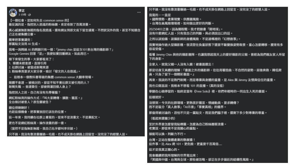 In response to public questioning, Li Zongying earlier today (28) responded to the “Invisible” fan page’s accusations. He clarified that the post was not AI-generated but also admitted he did not watch the Taipei 101 climb live.