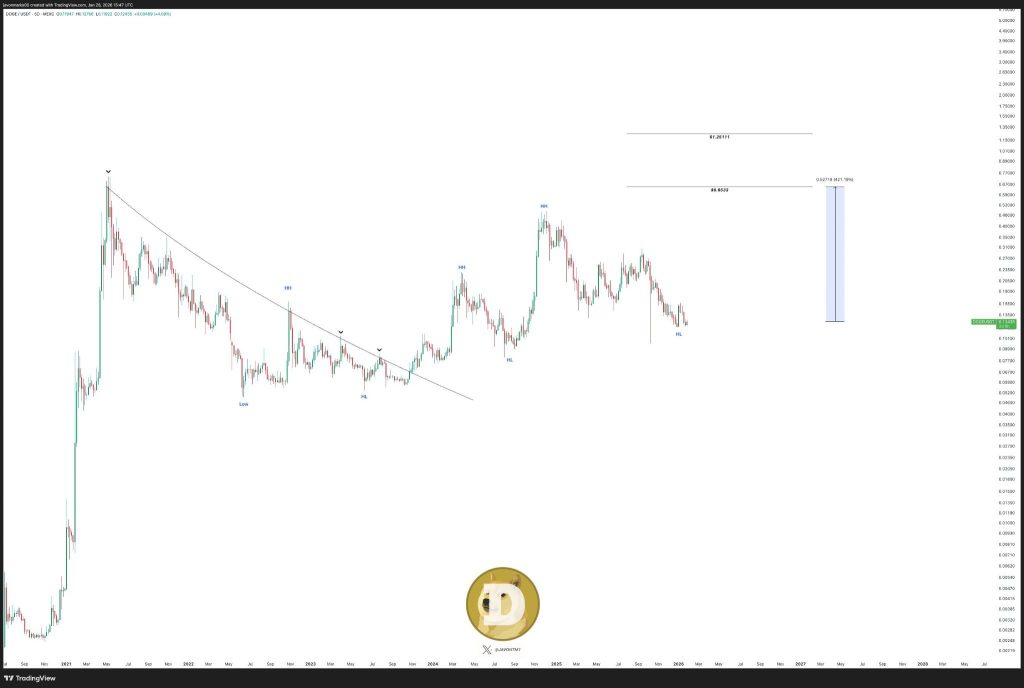 The idea behind Javon Marks’ take is pretty simple, and the chart makes it easy to follow. After spending a long time stuck under a curved downtrend that capped rallies through 2021, 2022, and much of 2023, the DOGE price finally broke above that resistance.