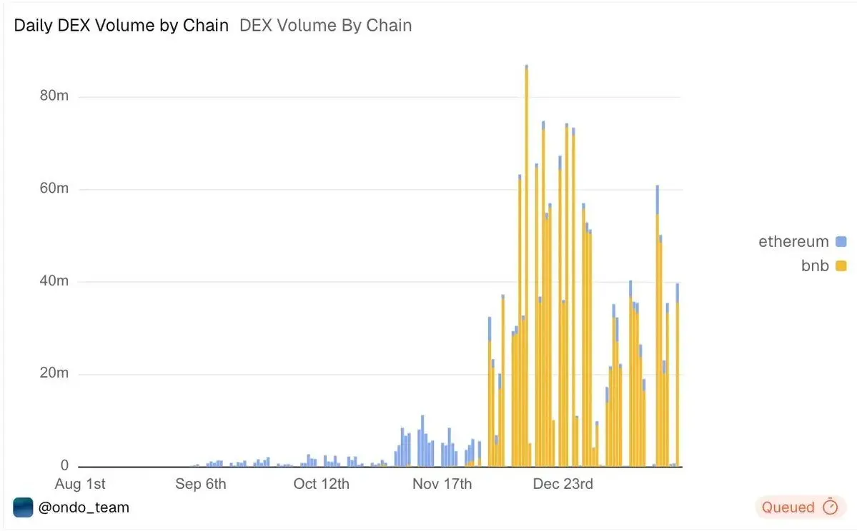 The first wave of genuine demand comes from traders who cannot access the US brokerage system and crypto-native users seeking US stock exposure without relying on TradFi infrastructure. Issuers have completed the most critical compliance and custody work, but the funds flow to the side that truly controls trading attention and distribution. Offshore platforms embed products directly into trading interfaces, naturally attracting trading volume. Ultimately, we see the vast majority of tokenized stock trading volume concentrated on BNB Chain, accounting for over 80%.
