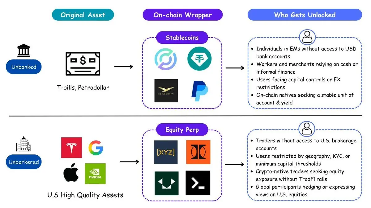 The US has never exported finance by exporting financial institutions themselves, but by exporting “access rights”. The petrodollar system disperses dollars globally, spilling inflationary pressures; stablecoins replicate this logic by wholesale US debt, turning the entire world into new USD holders without the need for banks or brokers. Onchain stocks are the next step in this logic. From unbanked to unbrokered, USD assets will once again be dumped globally.