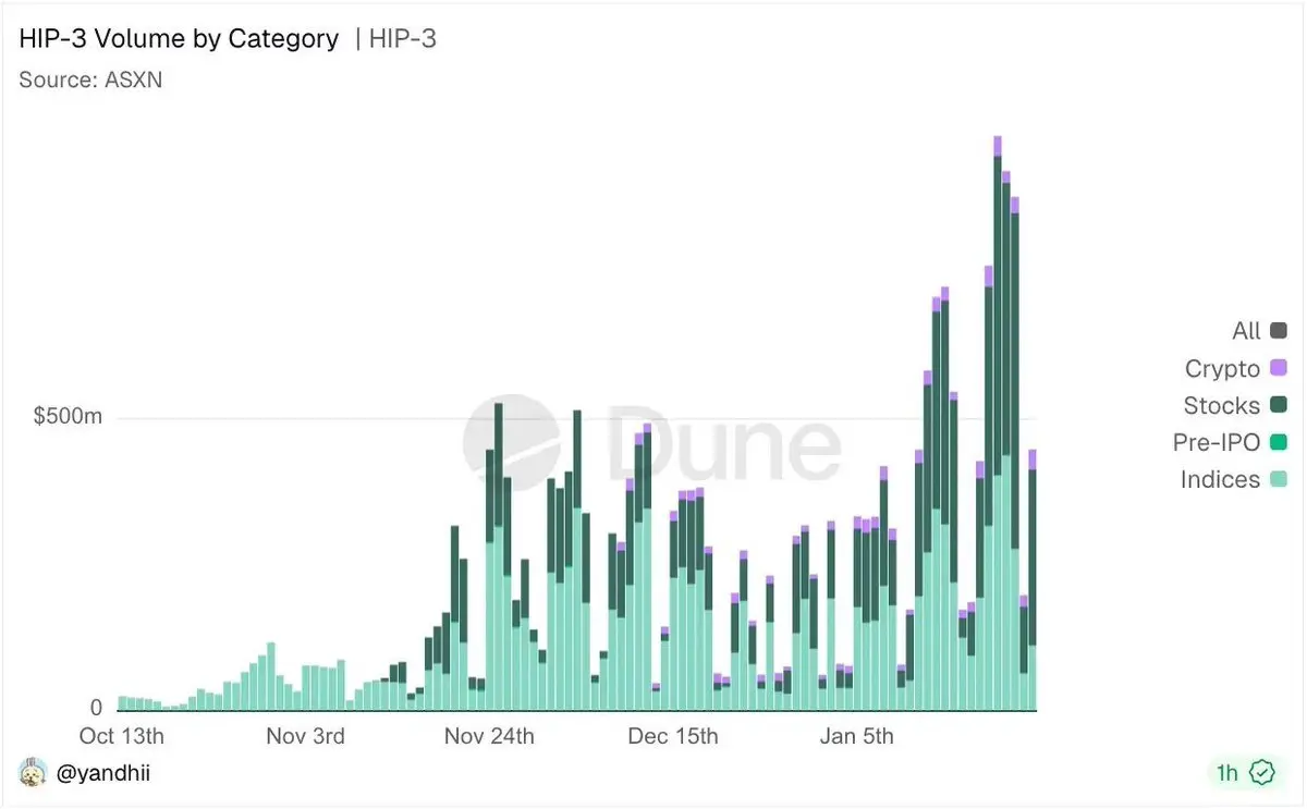 Take HIP-3 as an example, which provides professional traders with a systematic basis trading interface, capturing cross-market dislocations, covering stocks, crypto assets, and indices. Under the overlay of potential airdrop incentives, trading volume continues to hit new highs.