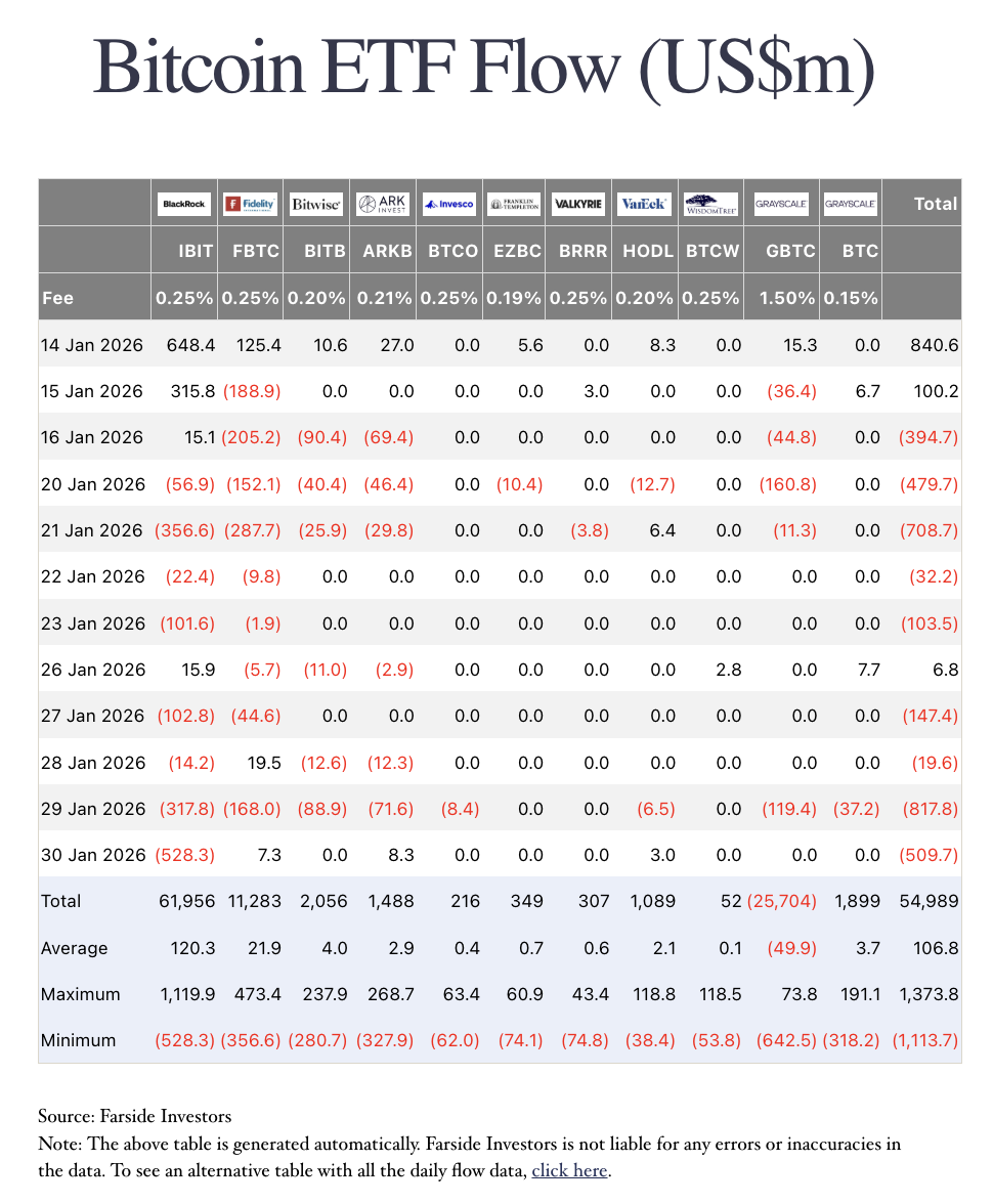 As a main driver of this bull market, US Bitcoin spot ETFs have now become a heavy burden on the market. According to Farside data, spot ETFs entered a massive withdrawal phase at the end of January, with a single-day net outflow of up to $817 million on January 30, seven to eight times the daily average. Among them, BlackRock’s IBIT performed the worst, with a single-day outflow of $528 million, followed by Fidelity’s FBTC and Grayscale’s GBTC. This “massive capital withdrawal” indicates that institutional investors are rapidly reducing risk exposure amid macroeconomic risks, causing the spot market to lose its most critical marginal buyers.