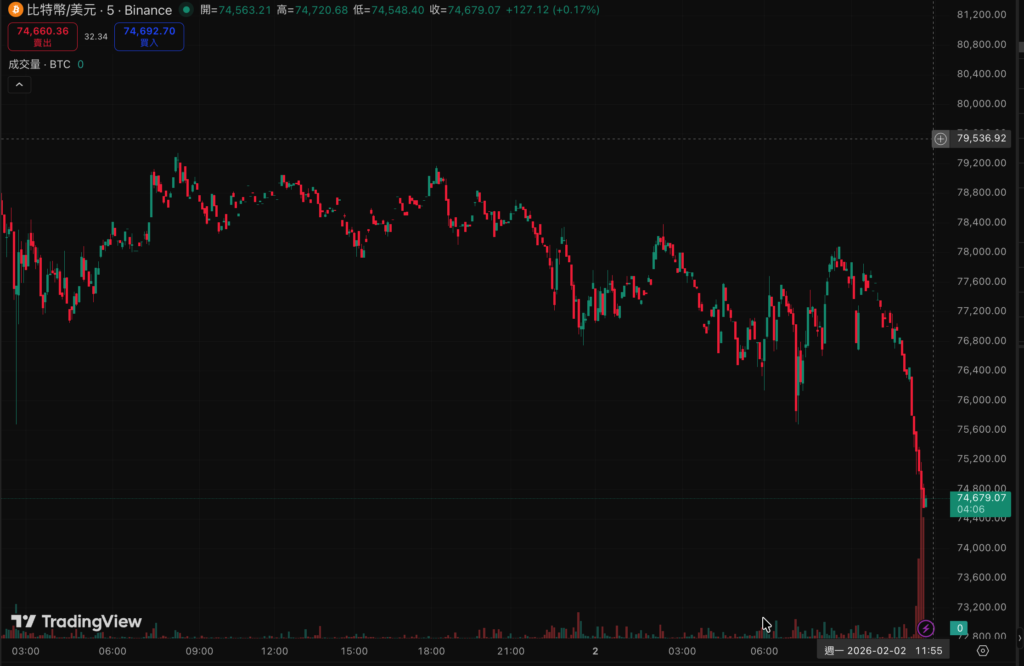 Bitcoin price plummeted to $74,600, officially breaking below MicroStrategy’s average cost of $76,037. This moment not only signifies that the world’s largest corporate holder is showing paper losses but also shakes the long-trusted institutional support level. The market is still experiencing a sharp decline; investors should prepare for risk management of their positions.