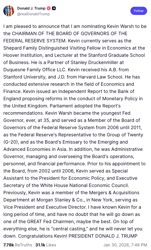 Image source: Truth Social Donald Trump officially announces his nomination of Kevin Warsh to succeed Jerome Powell as the next Fed Chair