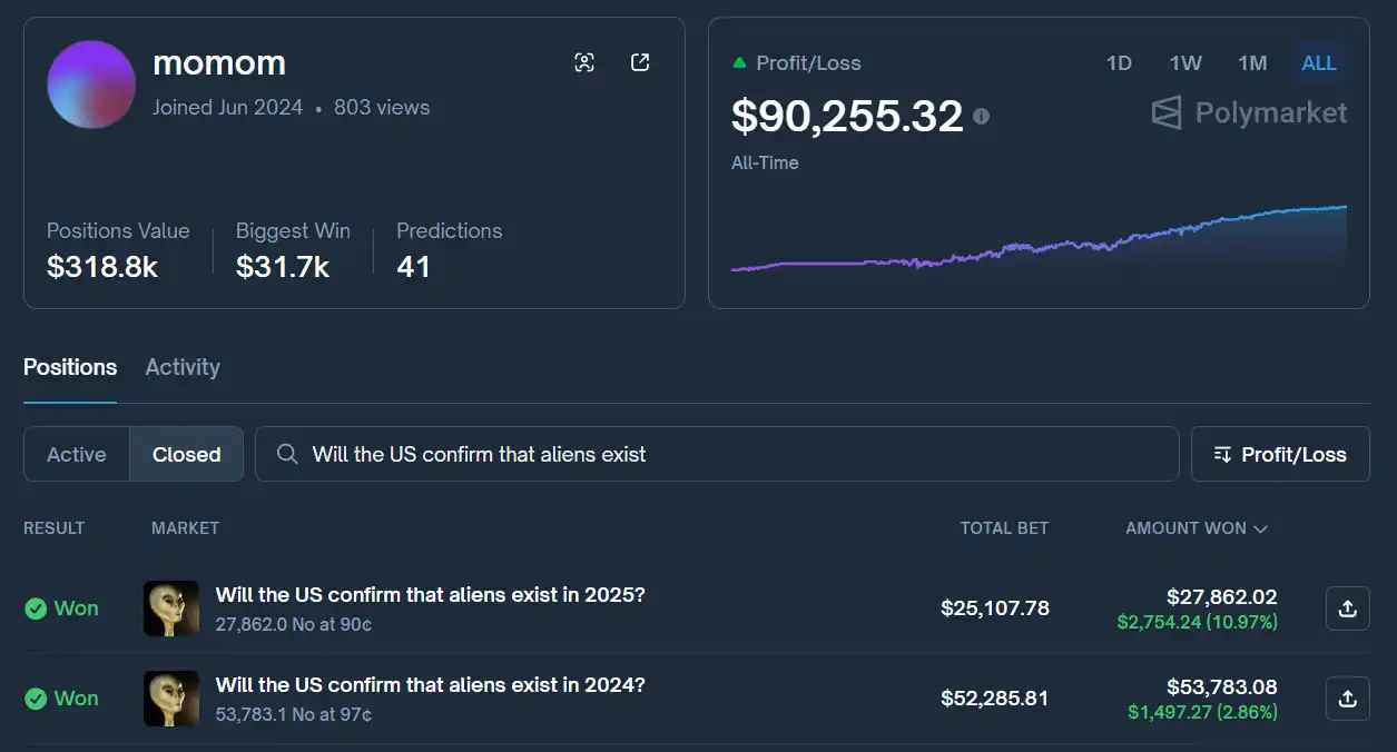 This is exactly what that account did last March: amid numerous market noises and overwhelming media reports, he bet that the US would not announce the existence of aliens within the next ten months when the probability was only 10%. That trade ultimately yielded him a 10% profit.