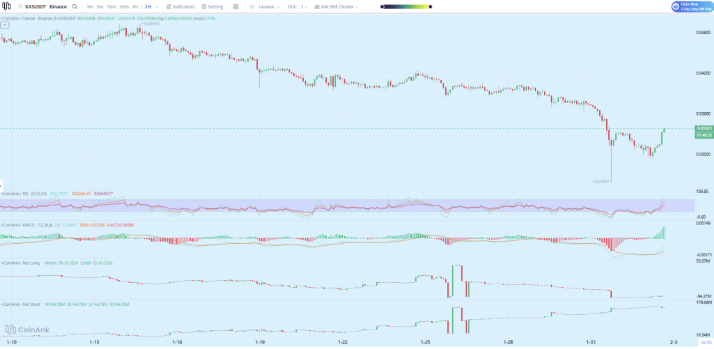 The Kaspa price is trading just above $0.033, bouncing after a sharp selloff that briefly pushed price close to $0.03. This area now stands out as the most important support on the chart.