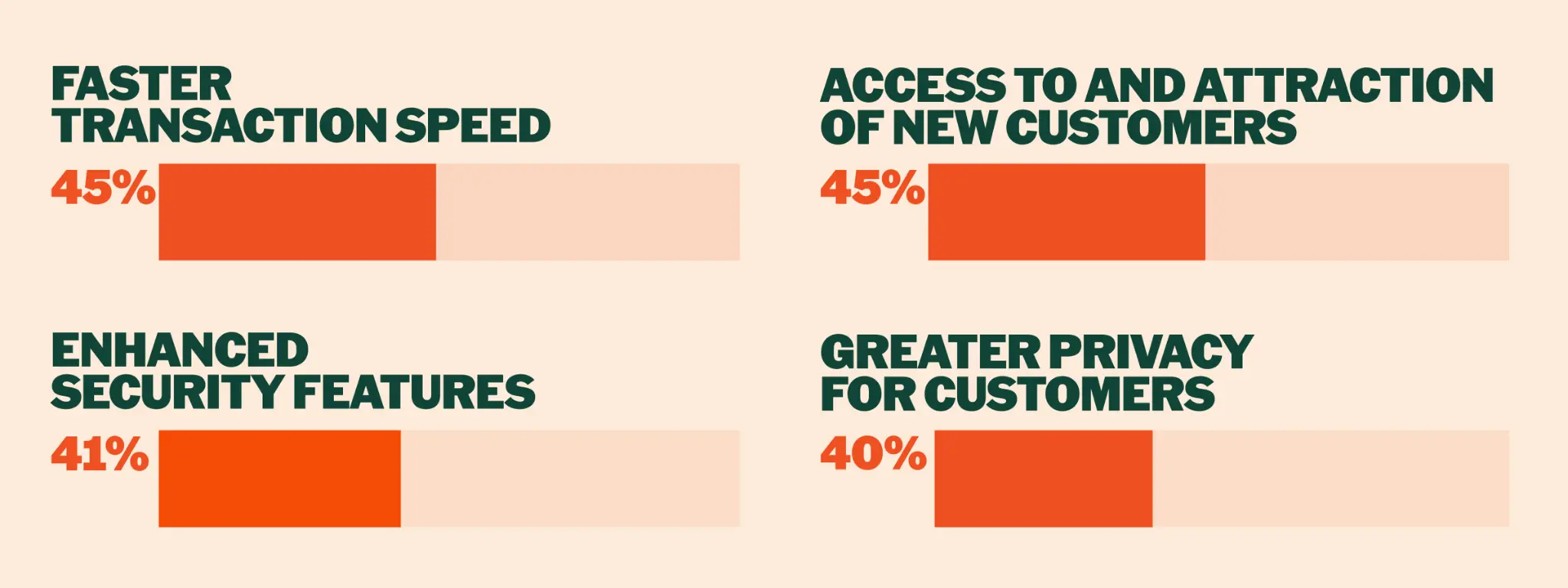 Faster Transactions (45%): Blockchain settlement eliminates intermediaries, significantly reducing payment confirmation times