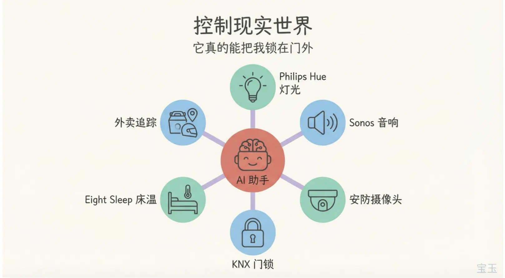 Email, calendar, all files, Philips Hue lights, Sonos speakers. He can wake himself up in the morning, gradually increasing volume. AI can also access his security cameras.