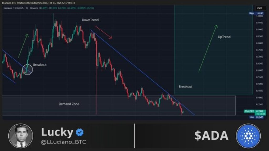 In Lucky’s chart, the prior breakout and uptrend are clearly marked. Those moves began from similar conditions: extended downside, weak sentiment, and the ADA price pressing into areas where sellers were already exhausted.