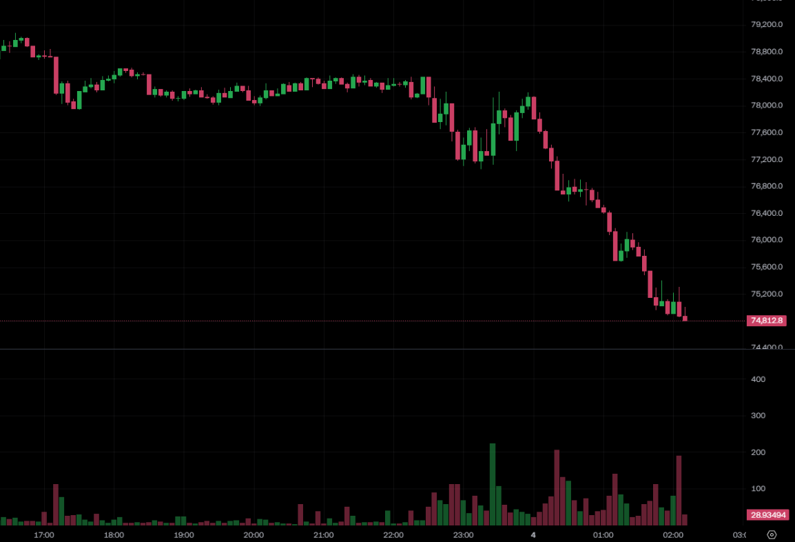 Around 2 a.m. Taiwan time on February 4, the cryptocurrency market experienced another clear correction, with Bitcoin briefly falling below the $75,000 psychological threshold and dropping to a low of $74,850, a 24-hour decline of over 4%. Ethereum (ETH) also sharply declined, down 4.60% within the day, once again breaking below the $2,200 support level.