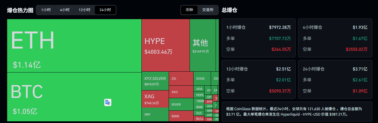 According to CoinGlass data, in the past 24 hours, a total of 121,126 traders worldwide have been forcibly liquidated (liquidation), with total liquidation amounts reaching $365 million (just in the past 4 hours, total liquidations approached $200 million). Among them, long positions account for about 70%, indicating that in a panic sell-off, leveraged long positions are heavily踩踏.