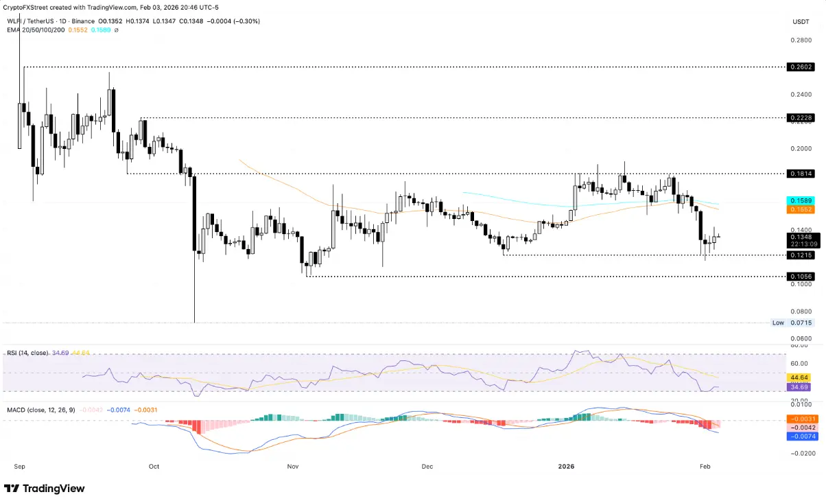 As of Wednesday, World Liberty Financial (WLFI) is trading around $0.1300, maintaining a gain of approximately 3% compared to the previous session. Nevertheless, the overall technical picture remains risky as the price continues to stay below the 50-day EMA at $0.1552, while the 200-day EMA at $0.1589 acts as a resistance ceiling, sustaining the long-term downtrend.