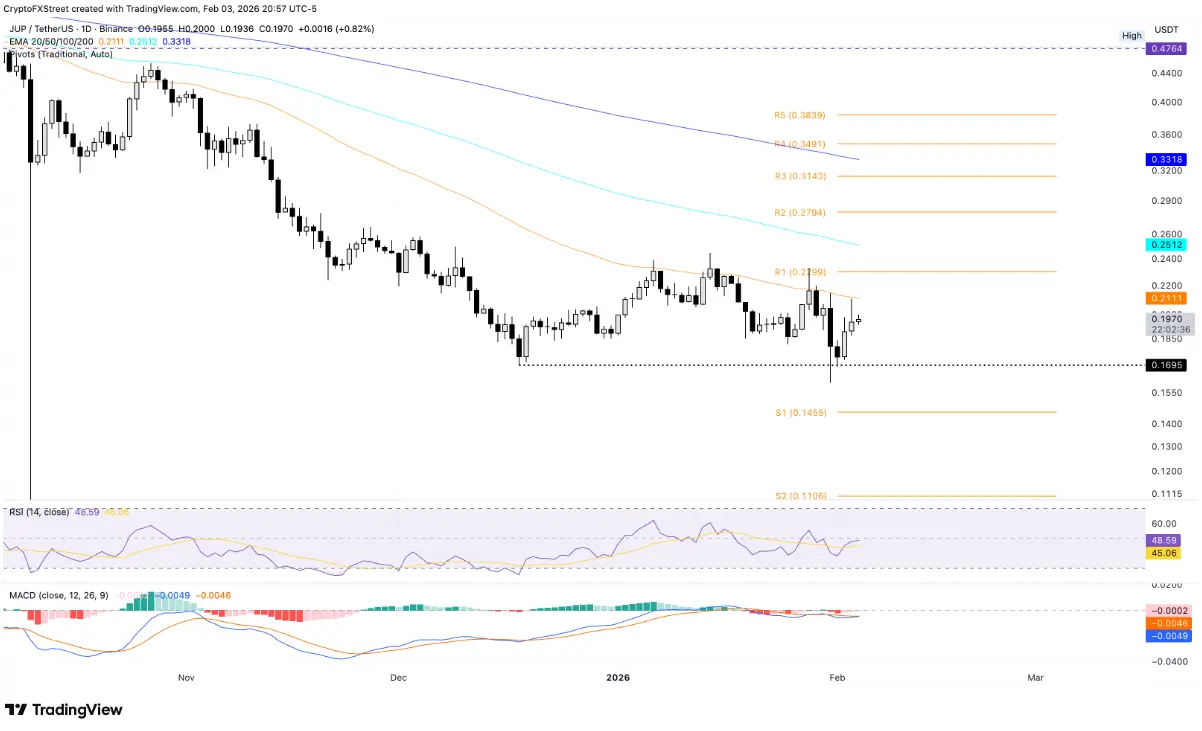The JUP token is still trading below the 50-day EMA at $0.2111, which continues to suppress its recovery attempts and maintains a short-term bearish bias. As of Wednesday, JUP has gained nearly 1%, extending its recovery after a 3% increase in the previous session.