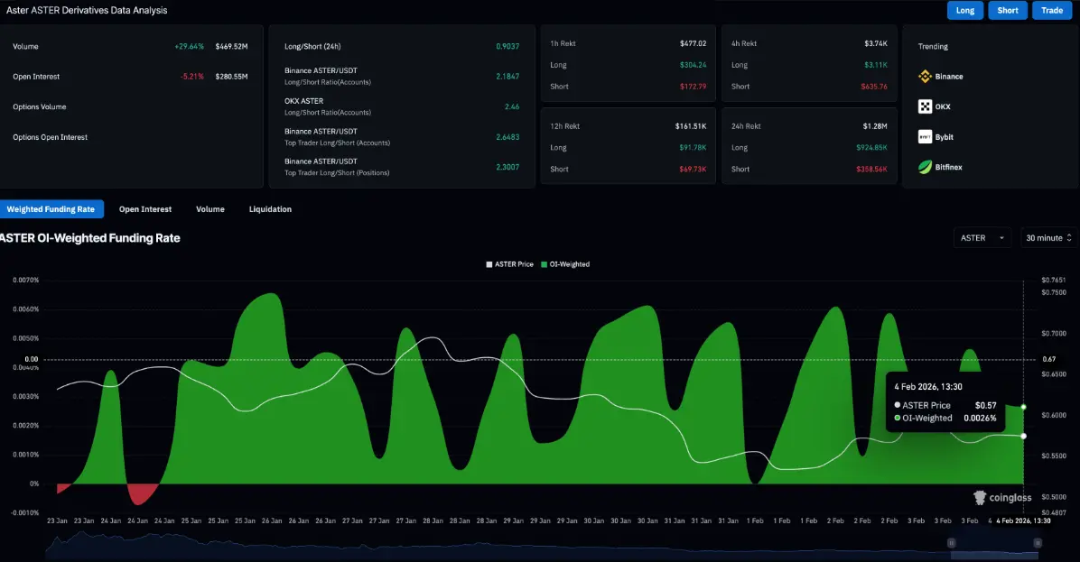 In the derivatives market, data from CoinGlass shows that the open interest (OI) of ASTER futures contracts has decreased by 5.21% in 24 hours, down to $280.55 million, reflecting a shrinking scale of open positions. Meanwhile, the funding rate has dropped sharply to 0.0026% from a peak of 0.0046% the previous day, indicating weakening bullish demand.