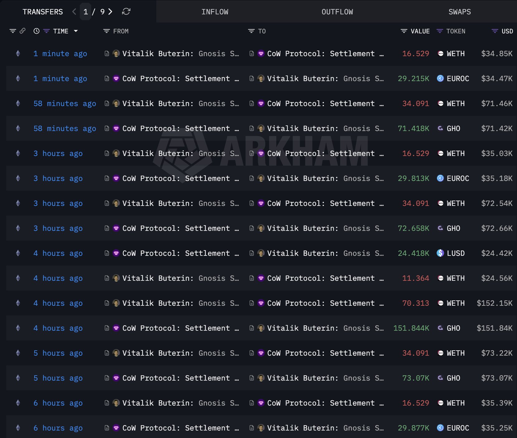 This batch of sales builds on earlier reports from platforms like Onchain Lens and Lookonchain, which tracked incremental outflows earlier in the week, including conversions to stablecoins such as USDC, GHO, and WETH via decentralized protocols like CoW Swap. Recent patterns show repeated small-to-medium transfers from Buterin’s Gnosis Safe-linked wallet to settlement addresses, consistent with phased, low-impact execution.
