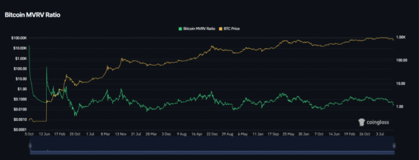 Bitcoin’s MVRV ratio, which compares its market price to the average price investors paid, has moved back to normal levels. Extreme readings seen at past market tops are not present.