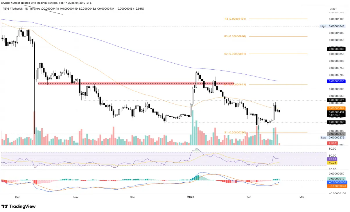 To establish a sustainable recovery, Pepe needs to successfully break through the key resistance at $0.00000521 — a level that has repeatedly hindered upward movement in late January. A breakout above this level could open new growth avenues, with the next target at the R1 pivot point at $0.00000633.
