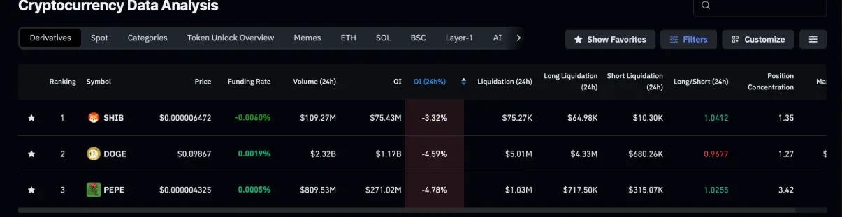 The weakening trend is not limited to Dogecoin. The open interest of SHIB and PEPE futures contracts decreased to $75.43 million and $271.02 million respectively on the same day, representing declines of over 3% and nearly 5%, indicating widespread selling pressure across the meme coin segment.