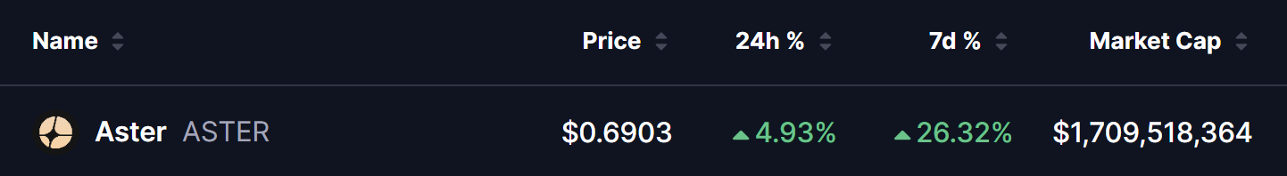 Market reaction appears constructive following the mainnet confirmation. At the time of writing, $ASTER is trading at $0.6903, posting a 4.93% gain over the past 24 hours and an impressive 26.32% surge over the past seven days. The token’s market capitalization currently stands at approximately $1.7 billion.