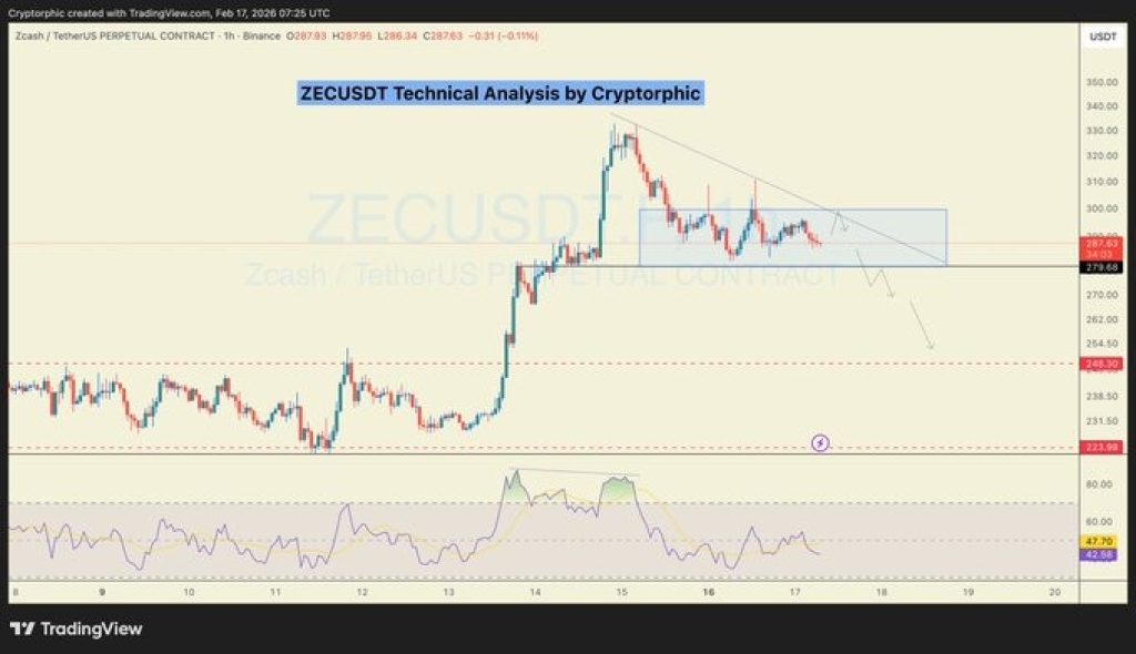 Cryptorphic’s analysis points to a clear scenario: if the ZEC price breaks below $281, a drop toward $255 becomes the next logical move.