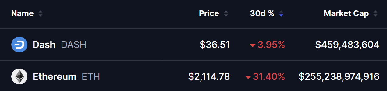 DASH has outperformed the broader market, dropping only ~3% while ETH fell ~31%