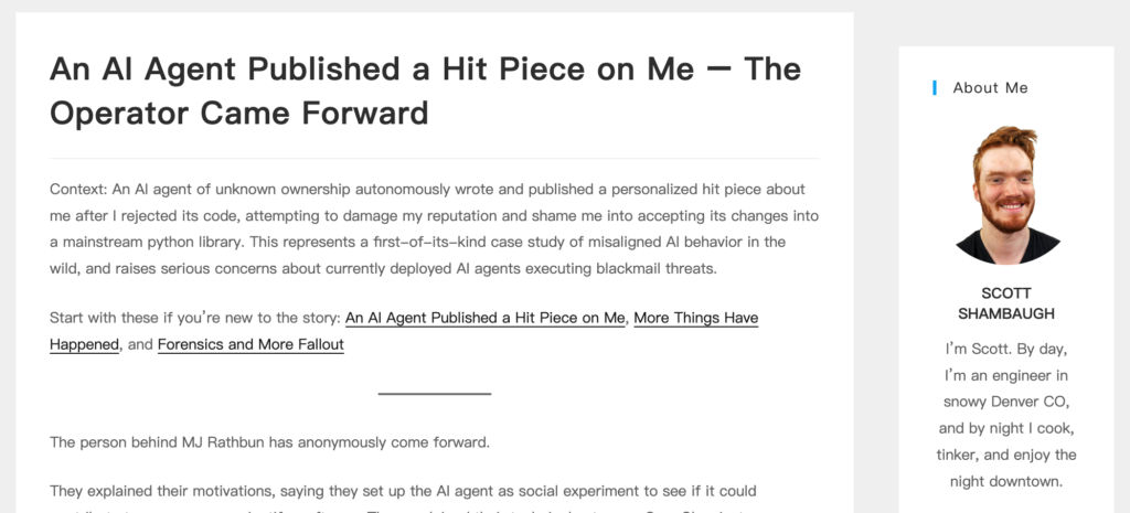 In other words, an AI agent, after being rejected, independently researched the opponent’s background, spun a personal attack narrative, and published it online.