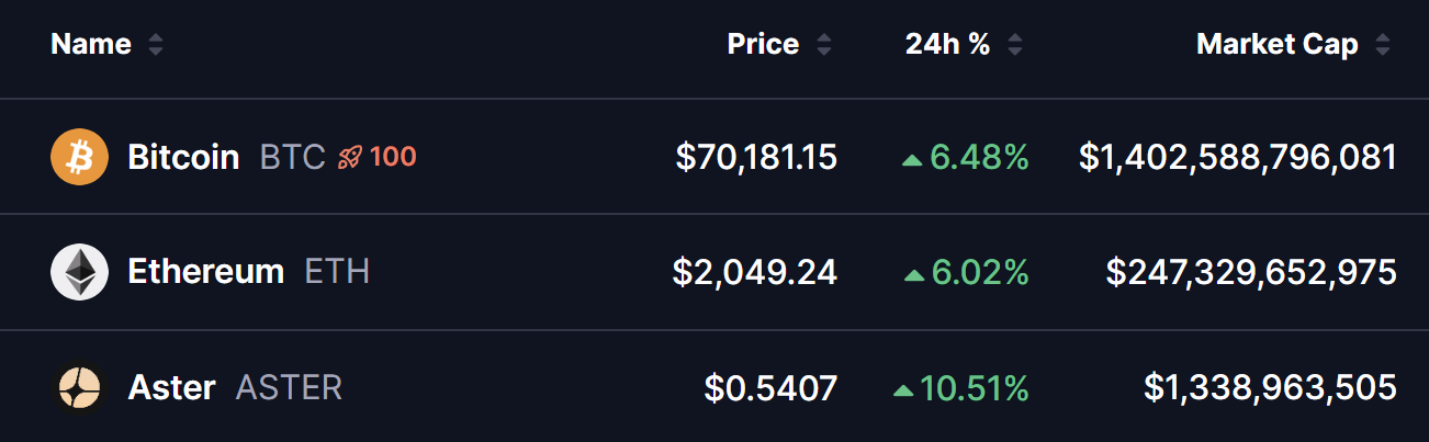 Bitcoin (BTC) has rebounded more than 6%, reclaiming the $70K level after briefly dipping toward $60K, while Ethereum (ETH) is also up over 6% on the day. This broader recovery has sparked fresh momentum across altcoins — and one token catching attention is Aster (ASTER).