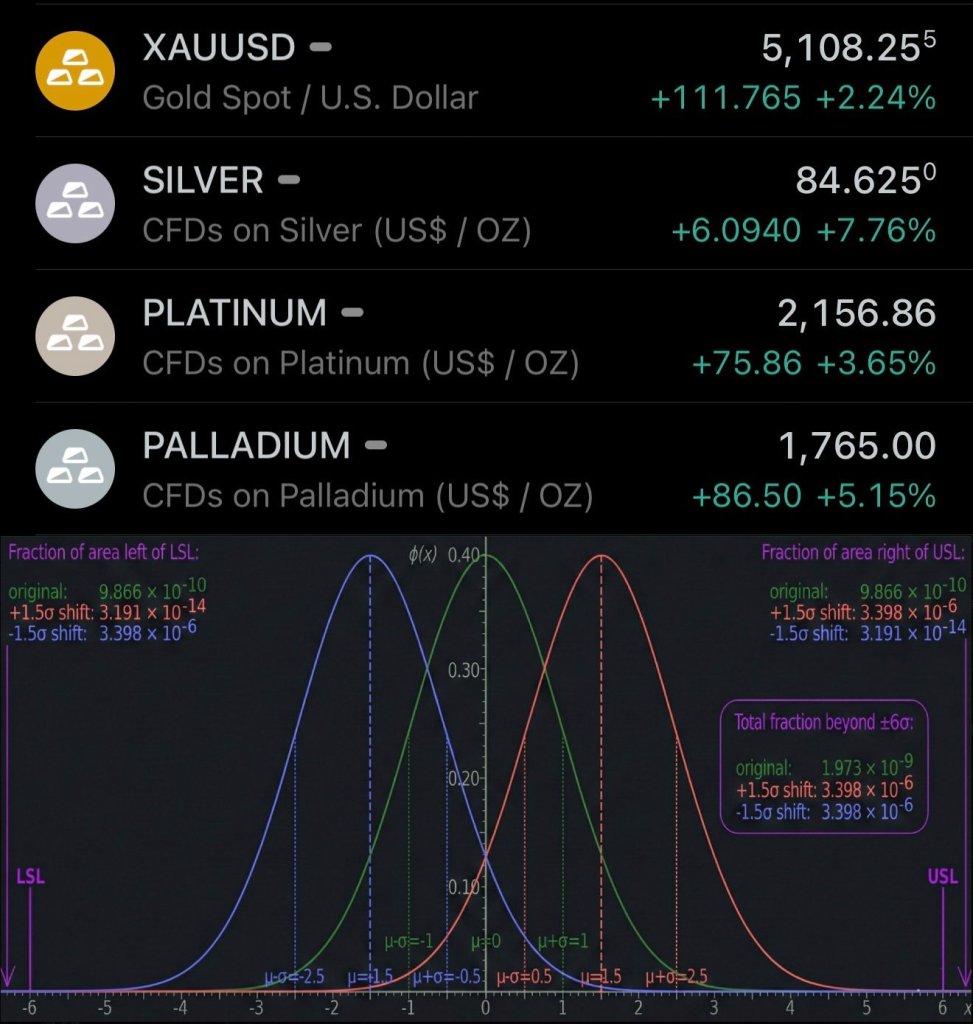Silver’s price action was particularly violent. A 5-sigma upside burst followed by a 6-sigma reversal in one session signals instability, not just strength.