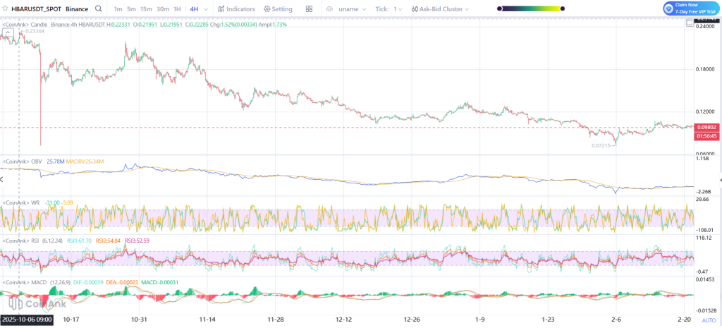 The Williams %R indicator is currently close to the middle area, indicating that HBAR is not significantly oversold or overbought. The RSI is also close to the middle area, confirming the previous statement.