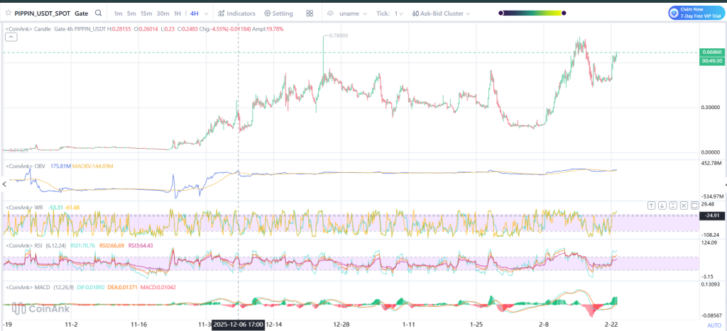 The PIPPIN Price built a base in the lower range before breaking out sharply. The recent move pushed it back toward the $0.66–$0.68 area, which is close to prior local highs.