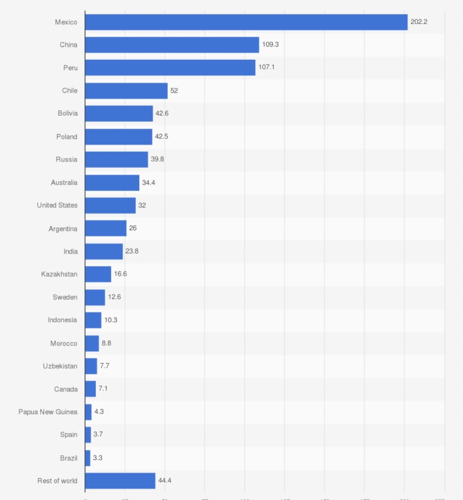 The chart shows global silver production by country. Mexico stands firmly at the top, producing roughly 202 million ounces annually; nearly double China and Peru. Combined, Mexico and Peru account for a significant portion of global mined silver, with South America responsible for roughly half of worldwide output.