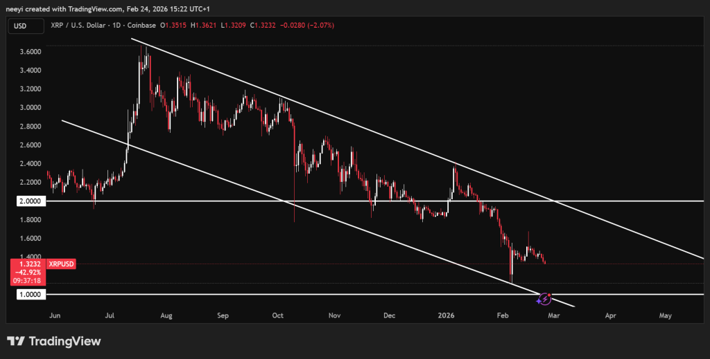 XRP price is now trading around $1.3 after sliding sharply from its July 2025 high near $3.6. That represents a decline of more than 60% in less than a year. The broader crypto market has struggled alongside Bitcoin, yet the structure on the Ripple chart now places XRP at a critical crossroads.