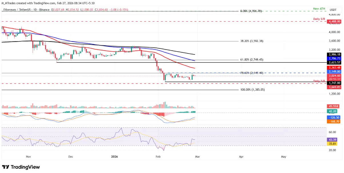 In a positive scenario, if buying interest returns, ETH could continue upward toward the resistance above the consolidation range at $2,149. Closing firmly above this level would open room for further gains, bringing ETH closer to the 50-day exponential moving average (EMA) at $2,363.