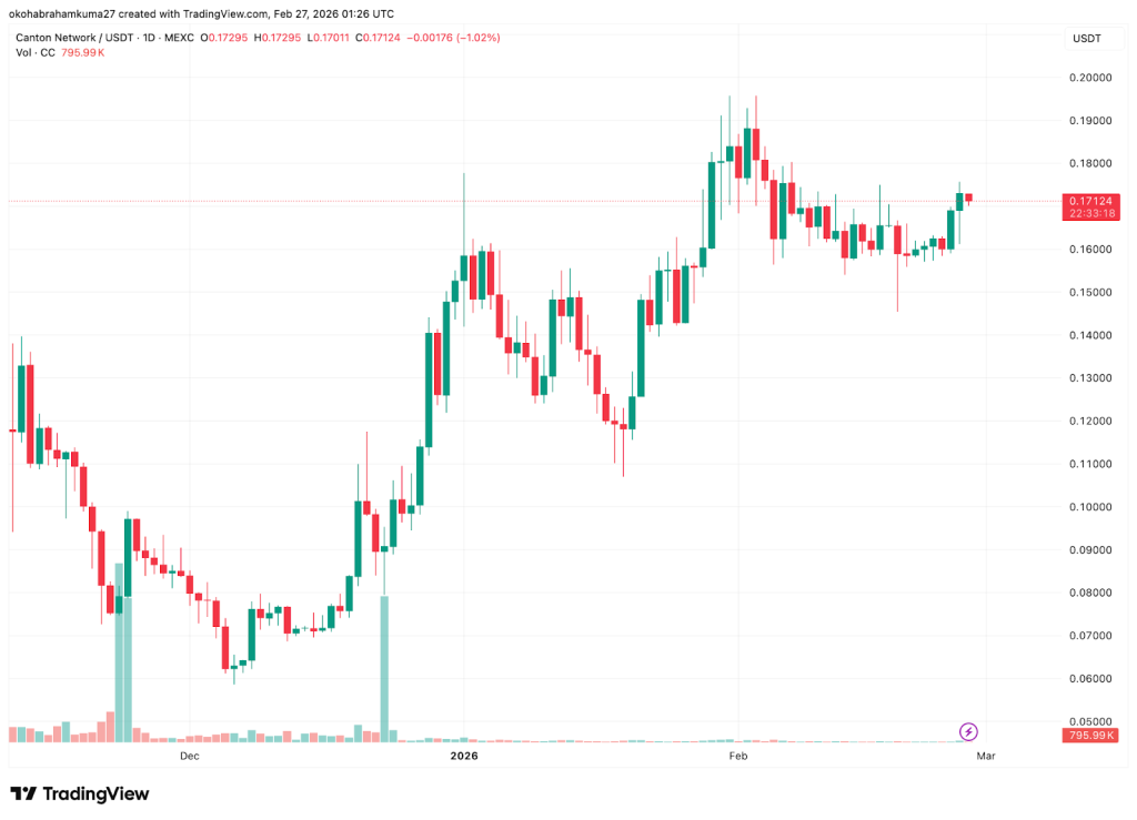The Canton Network benefits from the recent Bloomberg integration. But the native Canton Coin faces severe market issues. The token is currently priced at $0.1729 as of February 26th. Moreover, it is suffering from an extreme fear index rating, despite a technically bullish sentiment.
