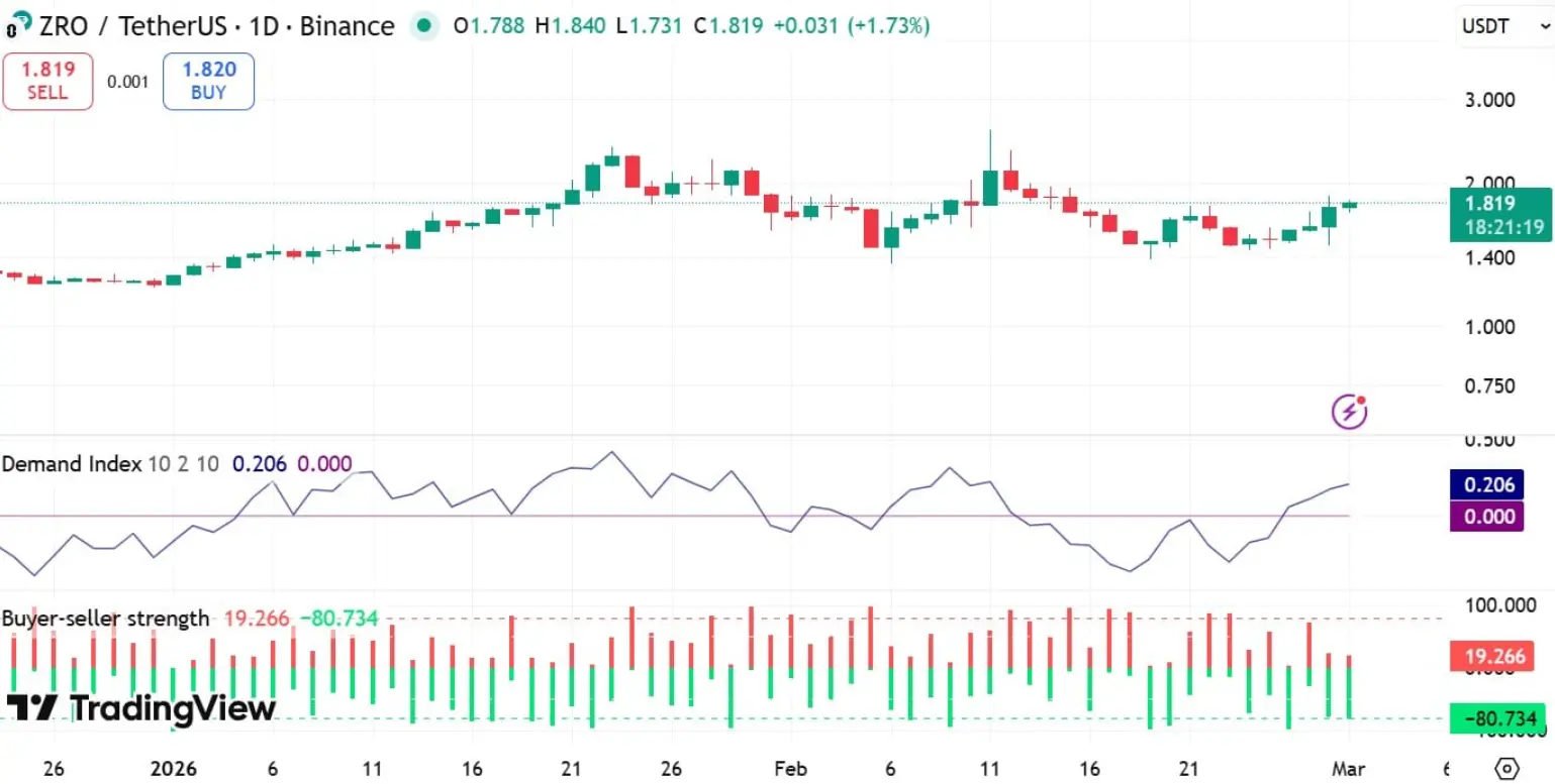 Earlier, LayerZero (ZRO) fell to around $1.30 during the late February correction. However, quick dip-buying activity helped stabilize the price early on.
