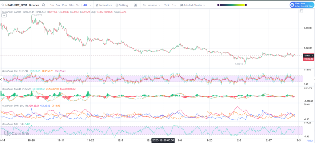 There is also clear resistance above. The $0.11–$0.12 area has rejected the price several times. Until HBAR price breaks clean through the $0.12 price level, the trend is still weak. The chart isn’t falling, but it isn’t strong either.