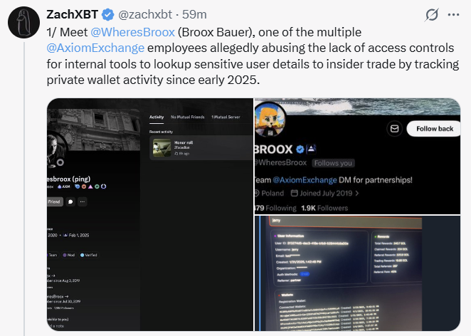 In a detailed investigative thread published on February 26, 2026, ZachXBT shared evidence suggesting that certain Axiom staff members used privileged internal dashboards to monitor user wallets, track trading activity, and exploit that information for personal profit.