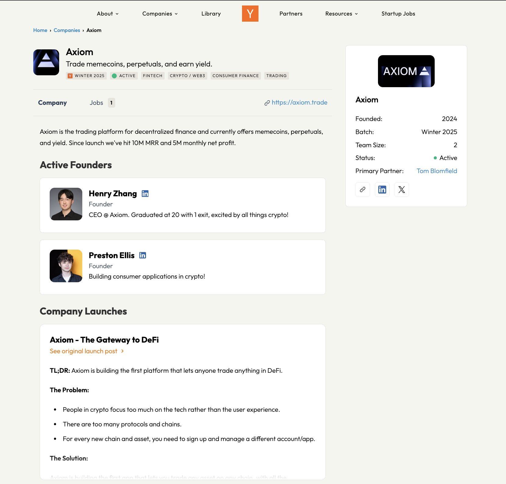 Founded in 2024, Axiom Exchange has quickly gained traction within the decentralized finance ecosystem. The platform offers tools for memecoin trading, perpetual futures, yield farming, and wallet analytics. The company reportedly participated in Y Combinatorâs Winter 2025 accelerator program and has generated hundreds of millions of dollars in trading-related revenue.