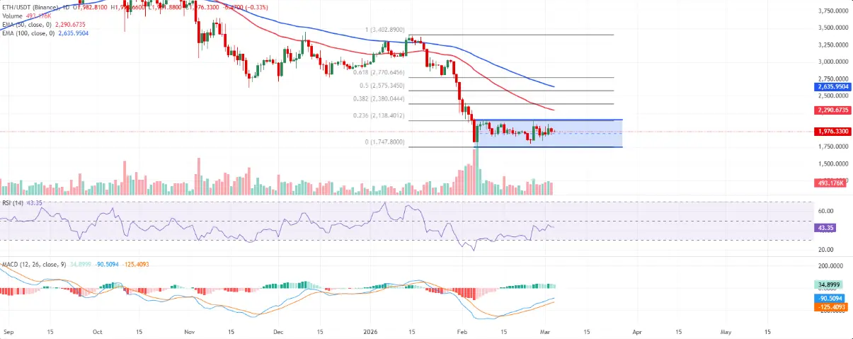 Daily ETH/USDT Chart | Source: TradingView Above, the zone between $2,138 and $2,148 — the confluence of the descending channel’s resistance and the 23.6% Fibonacci retracement (from $3,402 down to $1,747) — is a critical barrier. A daily close above this area could pave the way toward $2,380 — the 38.2% Fibonacci retracement level — where the 50-day EMA is likely to exert further pressure.