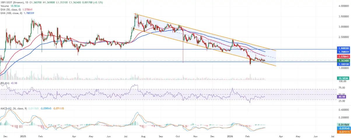 XRP is trading around $1.36 at the time of writing, but the technical outlook remains cautious. The price continues to be confined within a downtrend channel starting from the over $2.80 high, keeping the short-term trend negative, although it has temporarily held above the lower boundary near $1.24.