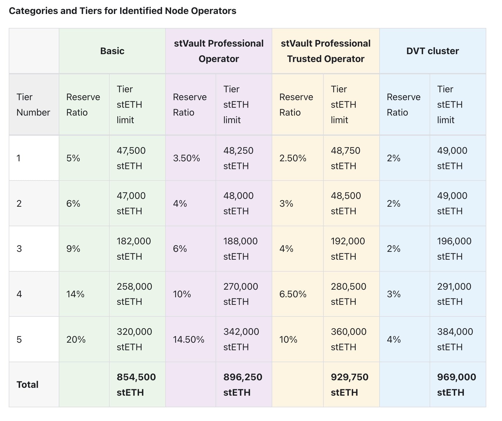At the basic level, the lowest tier comes with a 47,500 stETH limit, while the highest has a 20% reserve ratio and a 320,000 stETH minting limit. The other new tiers are the stVault Professional Operator, the stVault Professional Trusted Operator and the DVT Cluster.