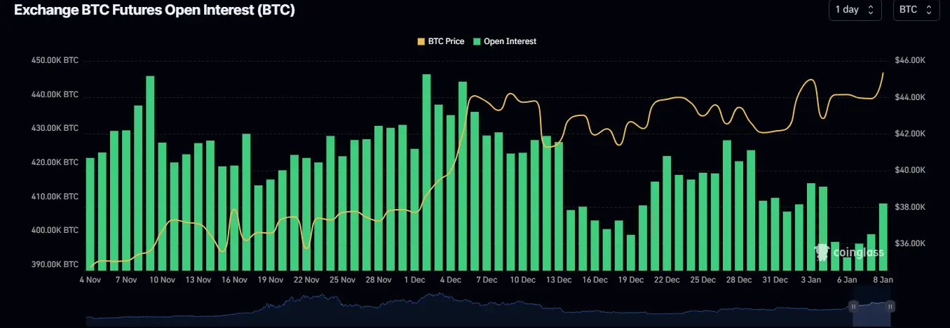 Adding to the fervor, Bitcoin futures open interest witnessed a substantial increase, reaching 407,400 BTC. According to data from CoinGlass, this surge represents a daily uptick of more than 8,000 BTC, highlighting the heightened interest and activity in the futures market of the leading cryptocurrency.